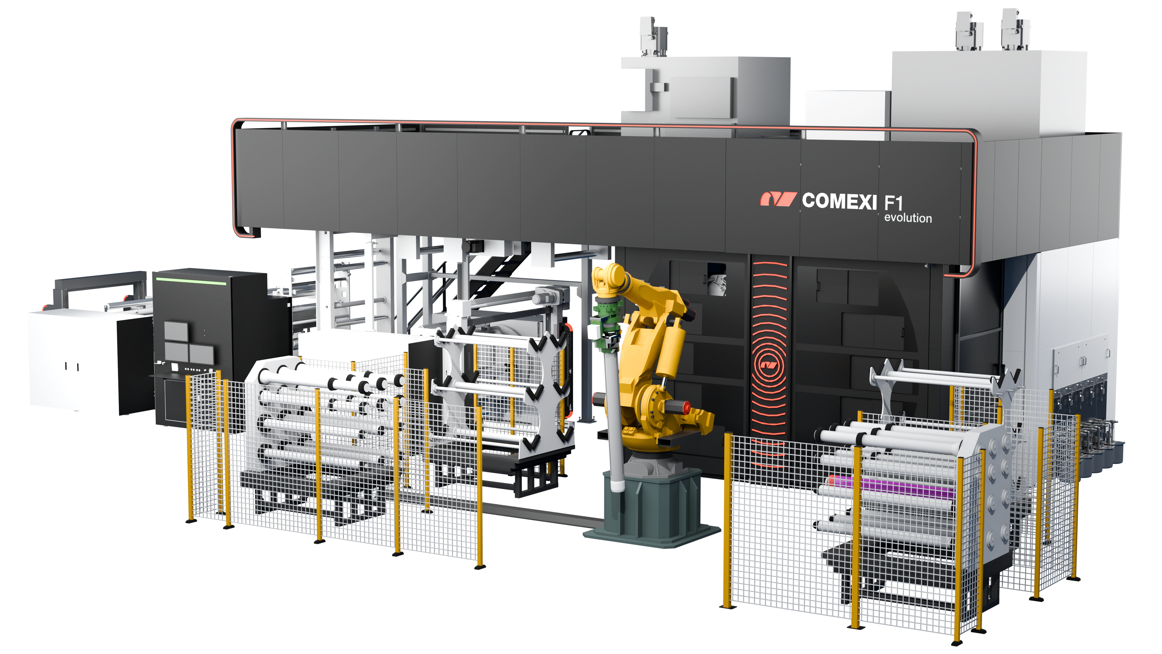 The F1 Evolution is capable of printing at a speed of up to 600m/min and a width of up to 1690mm with excellent robustness and drying capacity. It can be equipped with a robotic arm for sleeve and anilox changes and has GeniusTech automation for initial setup, adaptable drying, and fast cleaning.