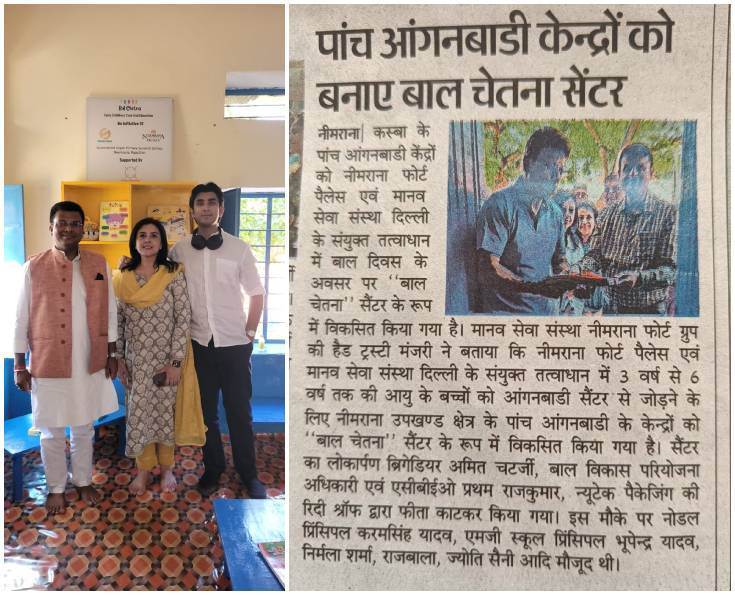 Nutech Packagings has also taken the initiative to sponsor two Aanganwadi centres. One is in Sanskriti School, Peepli Village, and the other in Mahatma Gandhi School, Neemrana Village. These centres have been beautifully adorned with colourful images and furnished with educational toys, tables, mats, chairs, and a TV for enhanced learning experiences. Academic books have been provided to the students, promoting knowledge and literacy. Additionally, Nutech Packagings has played a vital role by printing and donating the teachers' training manual for the schools, contributing to their educational development.
