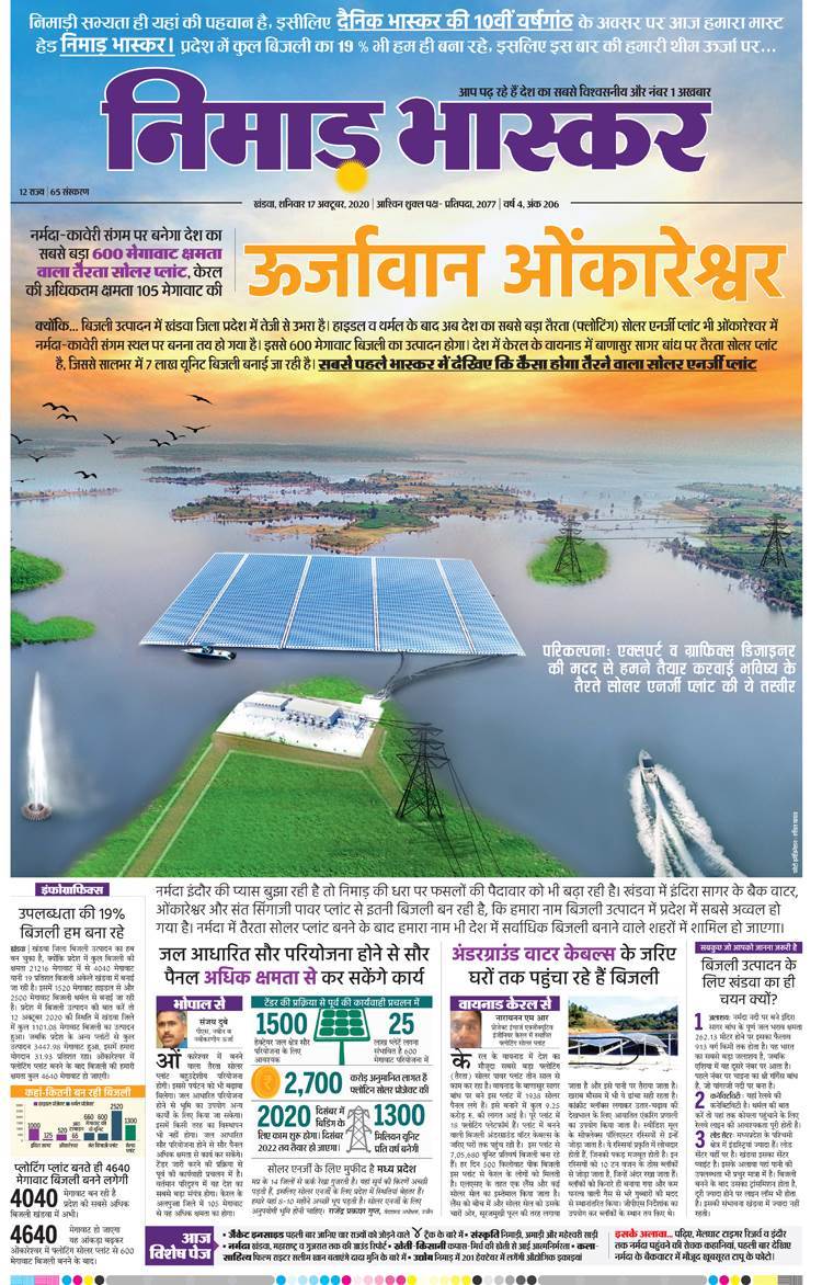 City edition: Khandwa in Madhya Pradesh, established in October 2010 Factory established in which year: October 2010 Team behind the machines: Sunil Salvi and his 23 personnel Design element for the special edition (Colour pages / any special print element): All colour pages product, were pre-inserted at the plant for delivery to readers. Workflow Paper: Solicam DB's feedback on the print job: On successful attempt of mega edition publication at other DB units, the team at Khandwa published the mega 84-page Anniversary edition. The edition was based on the renewable energy potential of the Khandwa region,. It presented the vision document of Urjawan Omakareshwar and received huge appreciation from the readers and advertisers |