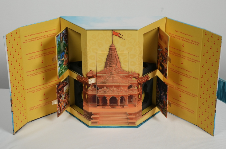 Festival gifting pushed this further. A Diwali dry fruit box balanced vegan leather handles with brass locks. A Ram Mandir-themed perfume set used pop-up engineering and devotional storytelling. A pyramid-shaped baby shower box solved functional challenges through modular, Lego-like design.