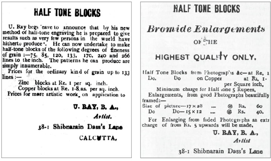 Upendrakishore began his writing career in the mid-1880s when he was a student. He mainly wrote for a young audience and also illustrated his own stories. By the mid-1890s, he was dissatisfied with the quality of printing of his illustrations and decided to experiment with the latest techniques of printing illustrations. He ordered a process camera and other equipment necessary to produce half-tone blocks. He went into business as 'U. Ray, B. A., Artist'. Besides half-tone blocks, he also offered "bromide enlargements of the highest quality only." In 1897, he was confident enough to assert in his advertisements in the Amrita Bazar Patrika that “he is prepared to give results such as very few persons in the world have hitherto produced.” His expertise in block-making drew clients from all over India; it could be Natesan & Co of Madras, the prolific nationalist publisher or the Raja of Aundh who wanted to print his own paintings.