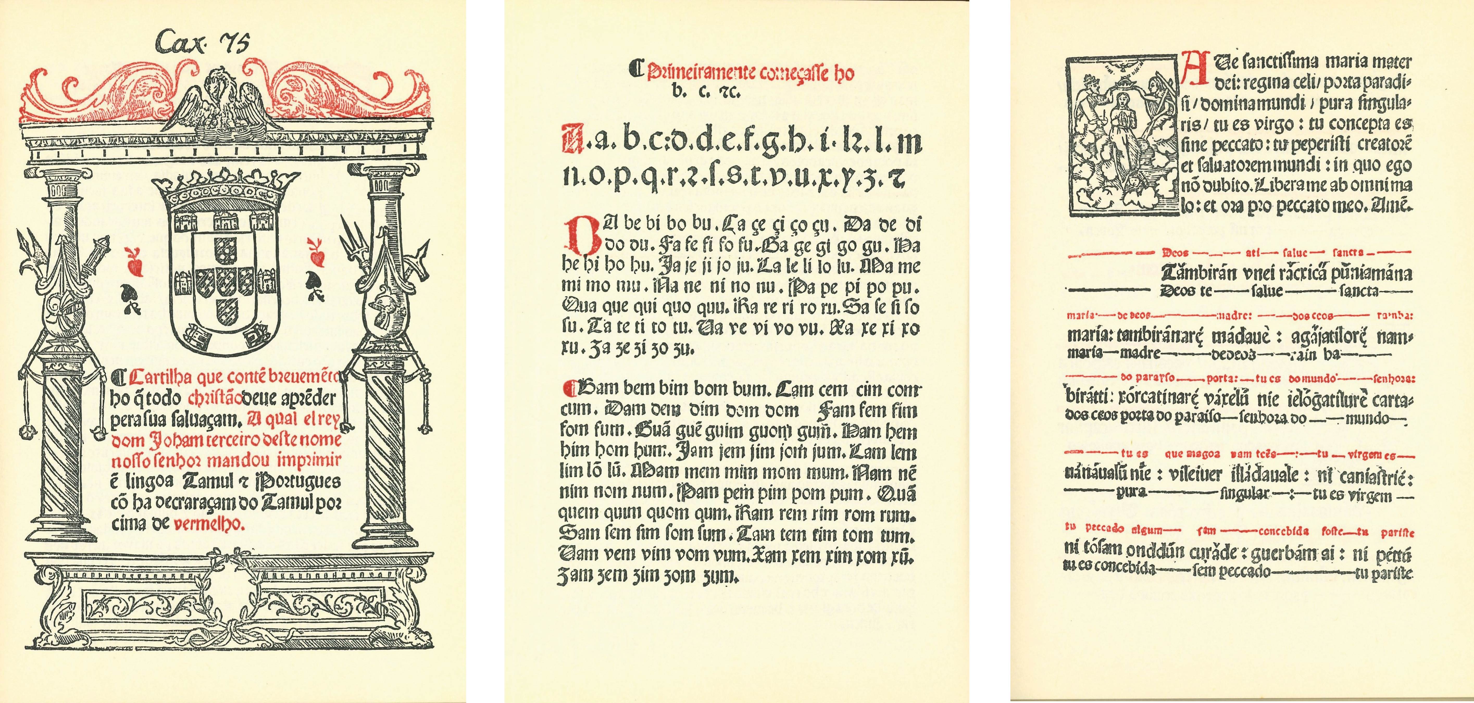 The 1554 imprint was a bilingual Tamil-Portuguese text titled Cartilha que contem brevemente ho q todo christão deve apréder pera sua salvação [A brief primer on what a Christian needs to know for his salvation]. The Tamil text, with a preface, was composed by three men from the Tamil country who were then in Lisbon. It is accompanied by an interlinear Portuguese version in two formats. The Tamil text is printed in a relatively larger Gothic typeface as compared to the Portuguese text. Above each line of Tamil text is a literal word-for-word translation printed in red ink, while below it, in black, is an idiomatic translation. The text is prefaced by an abecedary with “Indications regarding transliteration and the phonetic peculiarities to be observed in the pronunciation and accentuation of Tamil in Roman script.” The title page is also printed in two colours, an innovation not to be seen in books printed in India until much later. The start of each section is signified by beautifully carved vignettes. The printing was commissioned by the Portuguese king and the book has all the hallmarks of a royal imprint. The printer was Germão Galhardo, a Frenchman who first established a printing press in Coimbra in 1530. He was one of the most prolific printers in sixteenth century Portugal and famous for his wide variety of vignettes and ornaments.