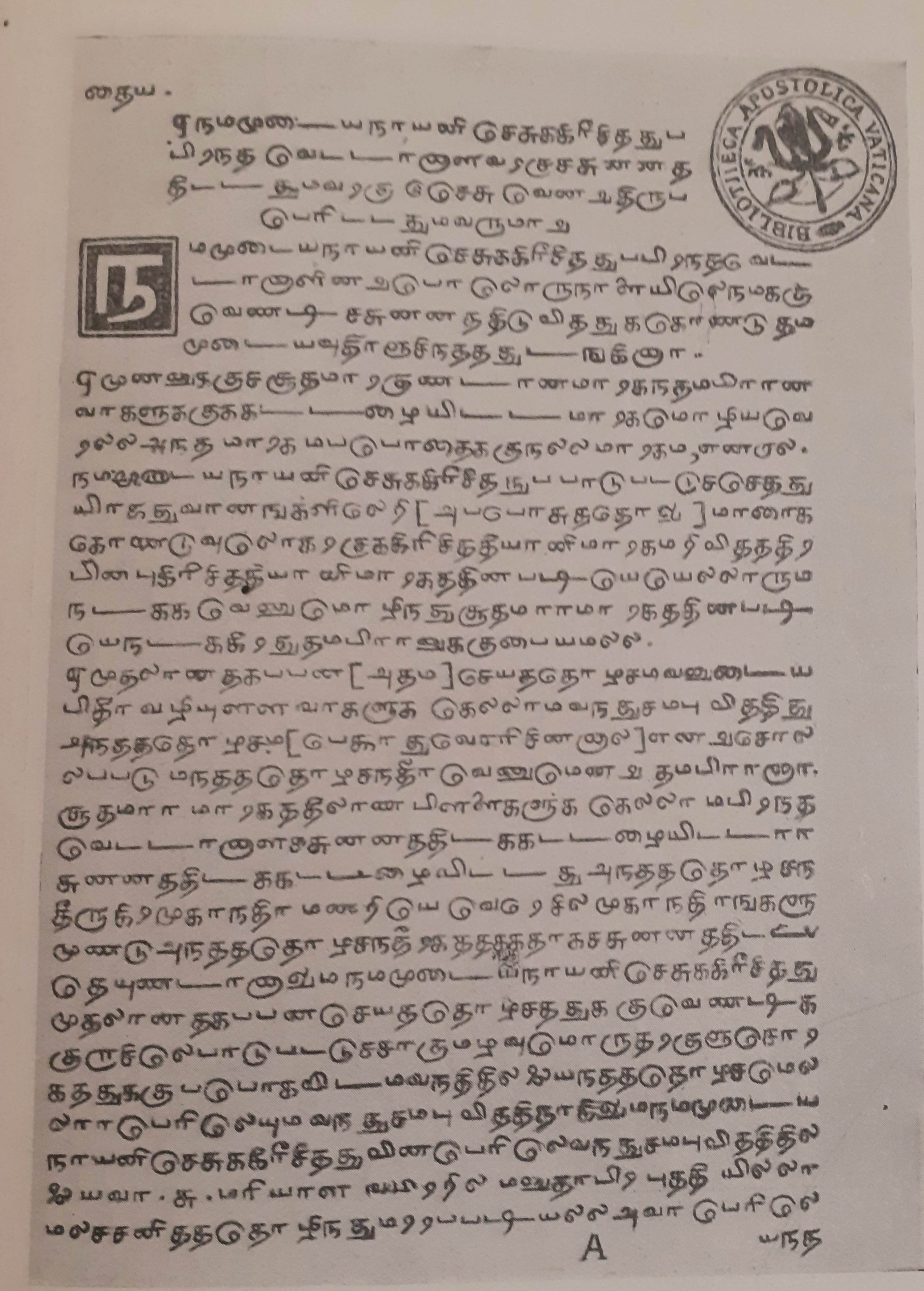 During the 1954 tour, Xavier Thaninayagam also visited the Biblioteca Apostolica Vaticana. As an alumnus of the Collegio de Propaganda Fide, he may have had ready access to its inner recesses. While working in the manuscript section of the library, he made two discoveries. The first was an early printed Tamil text: the monumental Flos Sanctorum [Lives of Saints] of Henrique Henriques printed at Punnaikayal in 1586. Since the title page and front matter was missing, a handwritten note in Spanish had been appended to the book leading to its misclassification as a manuscript. Secondly, he discovered the printed version of Vocabulario Tamulico (printed in 1687 at Ambalacatta), a book whose manuscript he had first seen in the Bibliotheque Nationale, Paris.