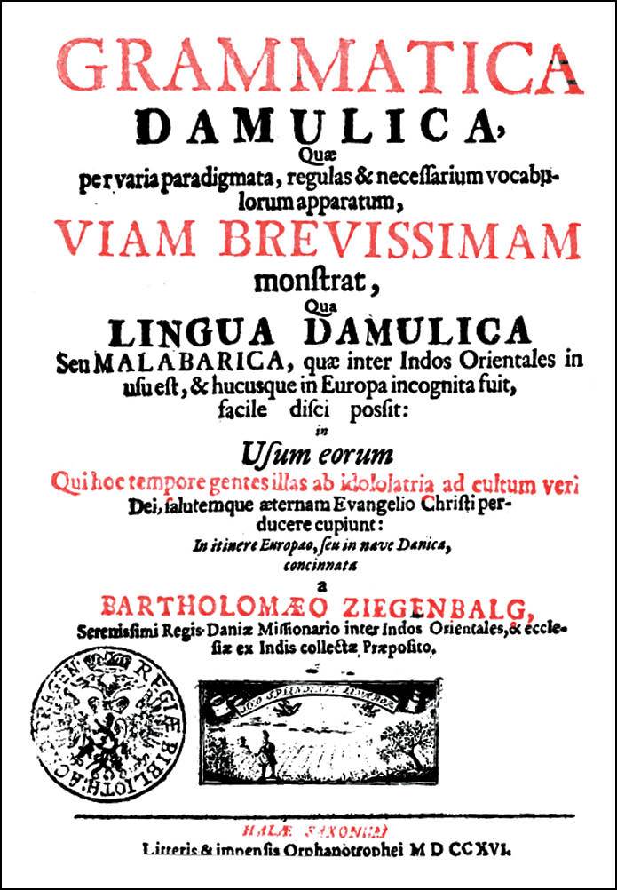 Grammatica Damulica by Bartholomew Ziegenbalg. Halle, 1716