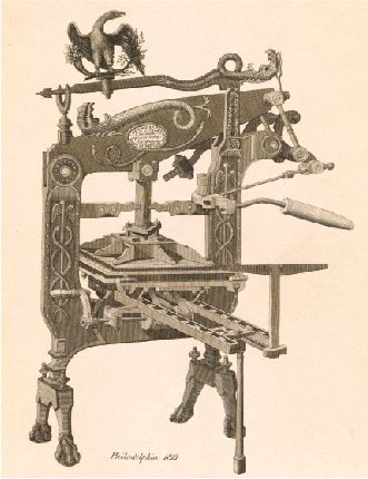 The printing press was set into operation after Jung Bahadur’s return to Kathmandu in 1851. This was one of the earliest instances in the Indian sub-continent of a princely kingdom establishing a printing press. Commonly known as the Giddhe Chhapkhana, it was located within the royal household. From the word giddhe, which refers to either an eagle or a vulture, one can surmise that the printing press was a Colombian printing press. It had, as its distinguishing feature, a bald eagle on its top lever which not only served as a counterweight but also as an ornament. Presumably, a font of Nagari type was also acquired, either at London or Calcutta, to print Nepali text. Some of the earliest imprints from this press were Nepali legal codes known as Muluki Ain. Though the first version of the legal code was compiled by 1854, it does not seem to have been printed until 1870 (Samvat 1927). This imprint, which runs to over 1200 pages, was printed at the Nepal Manoranjan Yantralaya. In the following decades, a few presses were established in Kathmandu, but they were under the direct control of court officials.