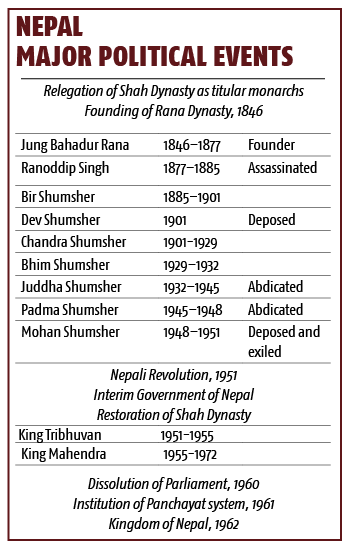 From the start of the twentieth century, the rulers of Nepal had ruthlessly suppressed any attempts to criticise or challenge their government. Writers and rebels went into self-imposed exile in India, presses were shut down and protestors executed. By the 1930s, the battlelines had been drawn for a three-cornered power struggle between the ruling Rana dynasty, the titular Shah dynasty and nationalist forces which first gathered around the Praja Parishad, and later, the Nepali Congress. Events unfolded rapidly in 1950; King Tribhuvan exiled himself to India; his infant grandson Gyanendra was appointed king by Prime Minister Mohan Shumsher Rana; and, the Nepali Congress resolved to take up arms against the Rana.