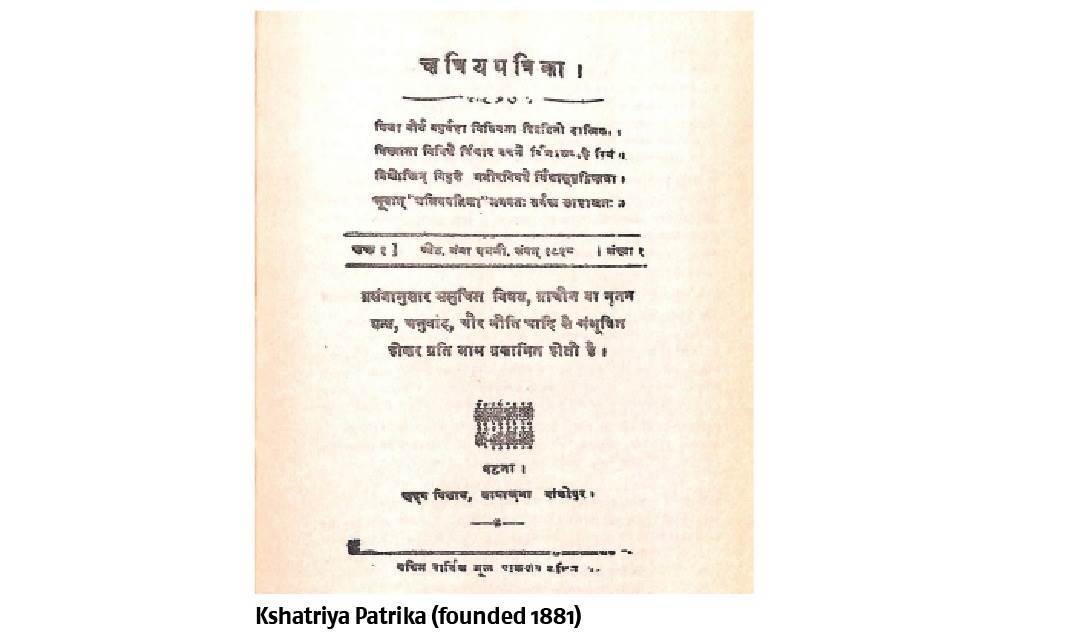 Not only did Ramdin Sinha edit and annotate the books he published, he was an author himself. His most important contribution was Bihar Darpan which contained biographies of important men associated with Bihar. He was also the editor of Kshatriya Patrika, one of the first periodicals to be published by Khadga Vilas Press. It built an impressive portfolio of monthly and weekly journals including Brahmin, Bhasha-Prakash, Shri Harishchandra Kala and Dvija Patrika. Though many of them had caste signifiers in their names, they were reformist papers that aimed to extirpate many of the social practises, such as child marriages, which were prevalent within these communities.