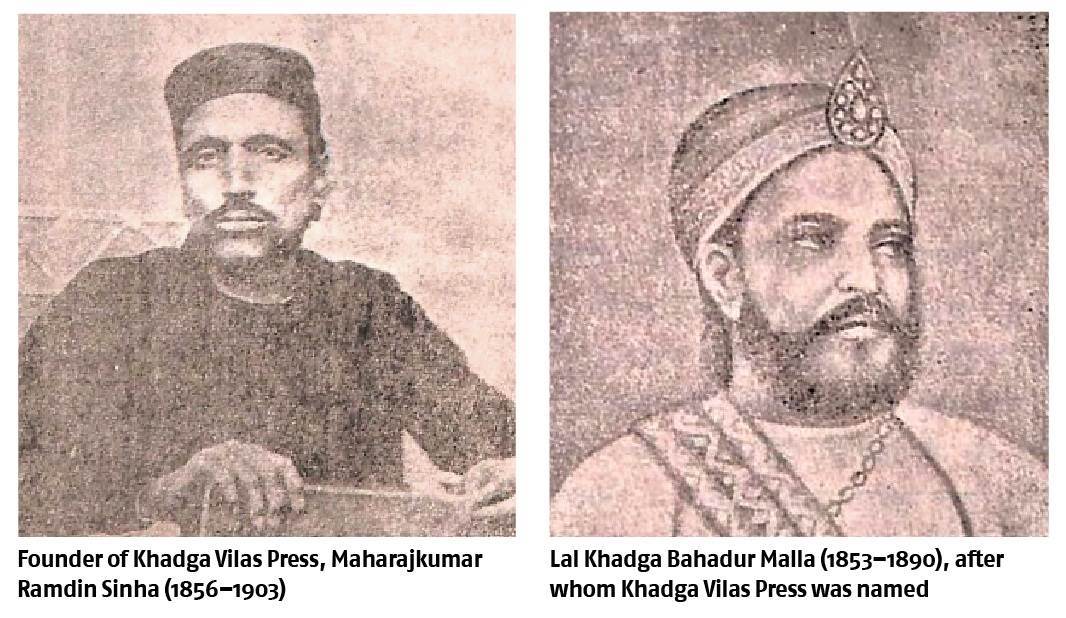 But many years before the foundation of Nagari Pracharani Sabha, a group of young men in their early twenties from Bihar were engaged with the Hindi question. This group was led by Maharajkumar Ramdin Sinha (1856–1903), whose family claimed a lineage from one of the many zamindar dynasties of Bihar which had been influential in the eighteenth century. Though much reduced in circumstances, Ramdin’s family was still part of the upper echelons of Bihar society. After a few years of formal education, Ramdin began working as a schoolteacher. Others in the group included his classmate, Ramcharitra Sinha (1858–1882); a distant relative, Saheb Prasad Sinha (1855–1901), who worked as a compositor in the Bihar Bandhu Press; and a close friend, Lal Khadga Bahadur Malla (1853–1890) who belonged to a zamindar family. As they debated on how best to develop Hindi, it became obvious to them that a library of Hindi printed books needed to be created. And, perhaps, they could contribute to this library themselves. Khadga Vilas Press, thus, came into existence.