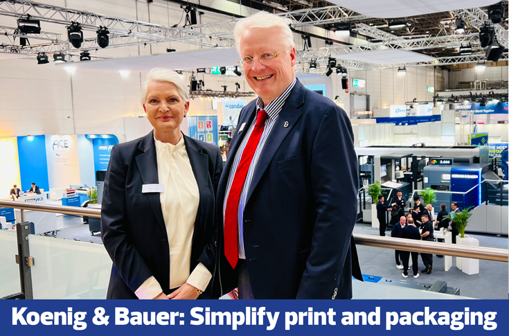 Dr Andreas Plesske, CEO of Koenig & Bauer and Sandra Wagner, vice president of digitalisation, Koenig & Bauer, in conversation with Noel D'Cunha of PrintWeek, discuss trends, technology and the future of print and packaging at the company’s stand during Drupa 2024