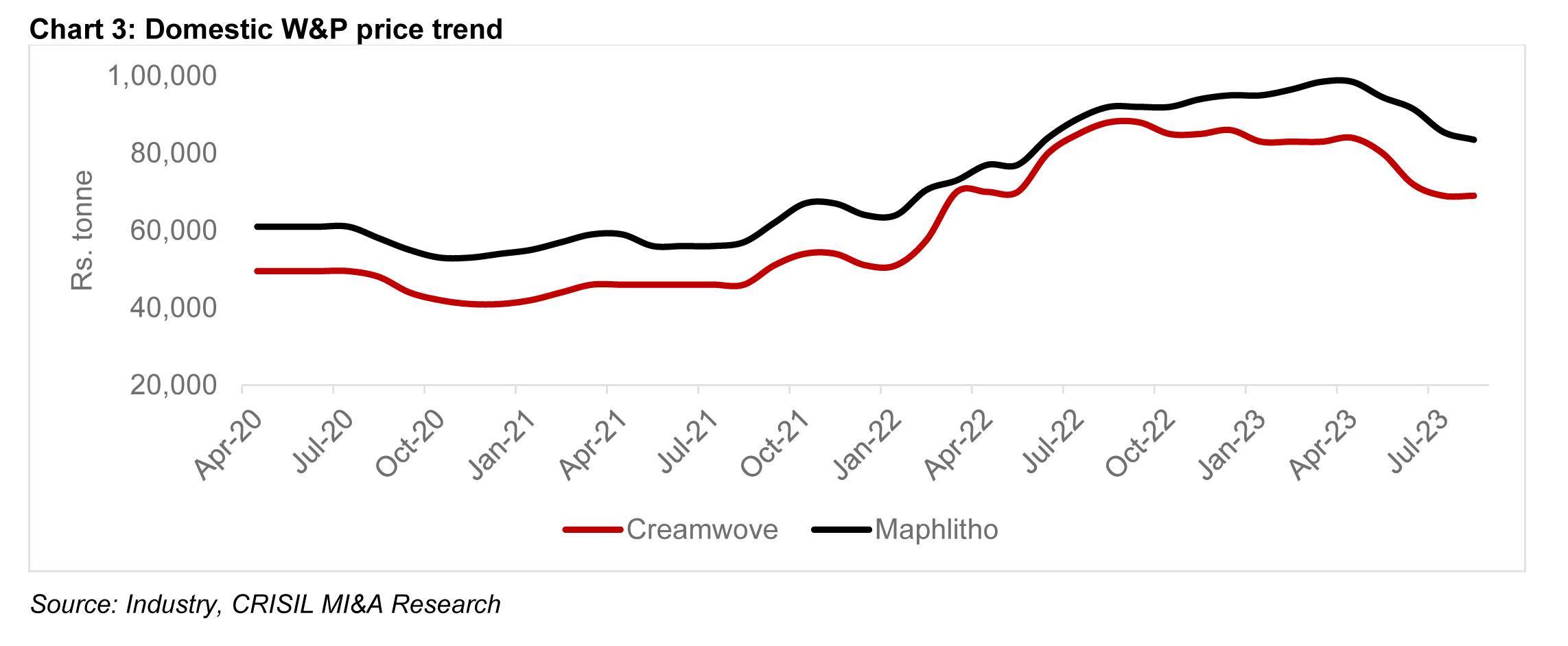 W&P paper prices (chart 3) could slip ~10% on-year this fiscal as domestic makers cut prices to pass on moderation in input cost and to combat domestic competition and cheaper imports from China and east Asia. Realisations had risen 50% last fiscal as consumption resumed, supported by increased demand from the education sector and corporates, while supply-chain issues kept prices of imported inputs elevated.
