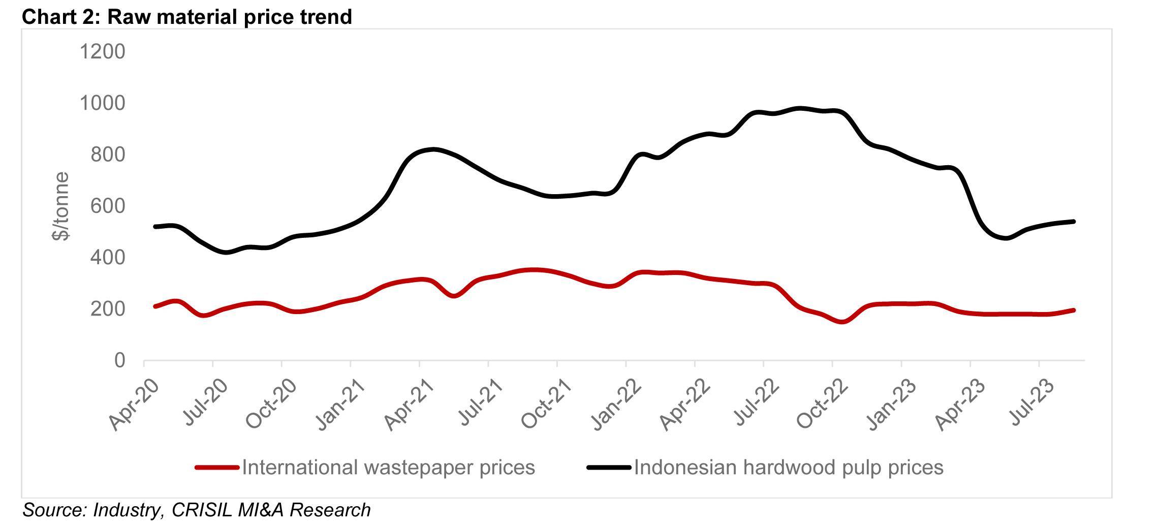 Packaging paper prices (chart 1) are expected to fall ~15%2 on-year this fiscal, following a steep correction in wood pulp and waste paper prices (chart 2), the key raw materials. Imported hardwood pulp prices slid to USD525-550 per tonne between April and August 2023 from $900 per tonne last fiscal, owing to weak demand in the US and Europe, and resolution of supply-chain constraints.